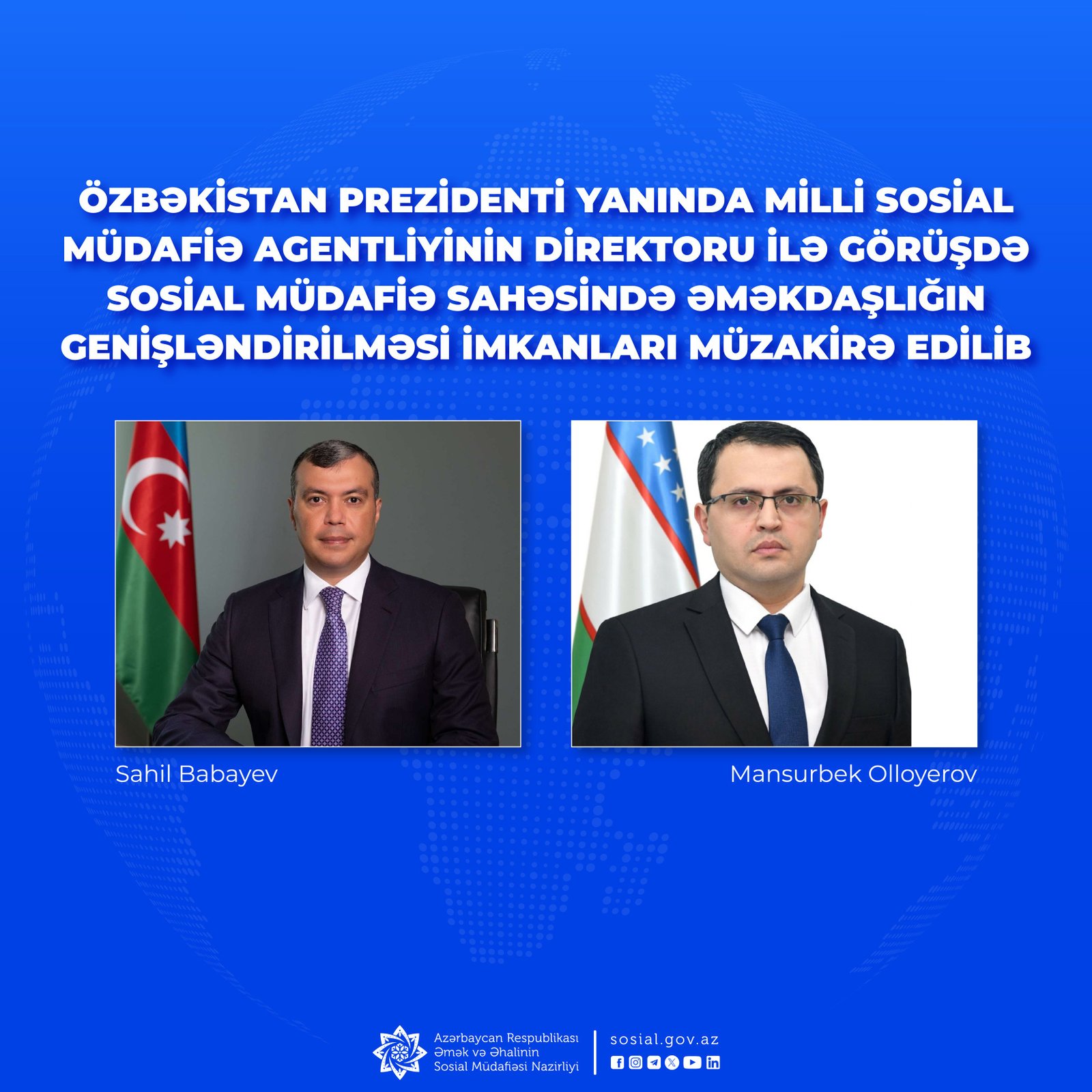 Əmək və əhalinin sosial müdafiəsi naziri Sahil Babayevlə Özbəkistanın məşğulluq və yoxsulluğun azaldılması naziri Behzod Musayev və Özbəkistan Prezidenti yanında Milli Sosial Müdafiə Agentliyinin direktoru Mansurbek Olloyerov arasında videoformatda görüşlər keçirilib.