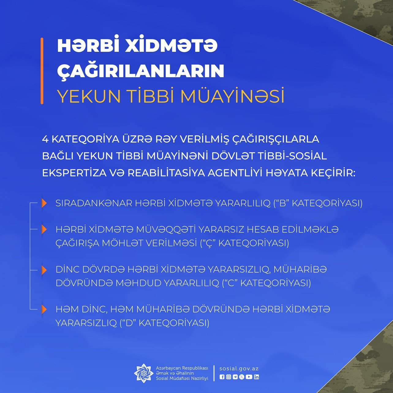 Prezident İlham Əliyevin Fərmanına əsasən, bu gündən müddətli həqiqi hərbi xidmətə çağırılan vətəndaşların tibbi şəhadətləndirilməsi zamanı aşağıdakı 4 kateqoriya üzrə qərarlardan birinin qəbul edilməsi üçün həmin vətəndaşların yekun tibbi müayinəsi Əmək və Əhalinin Sosial Müdafiəsi Nazirliyi tərəfindən həyata keçirilir: