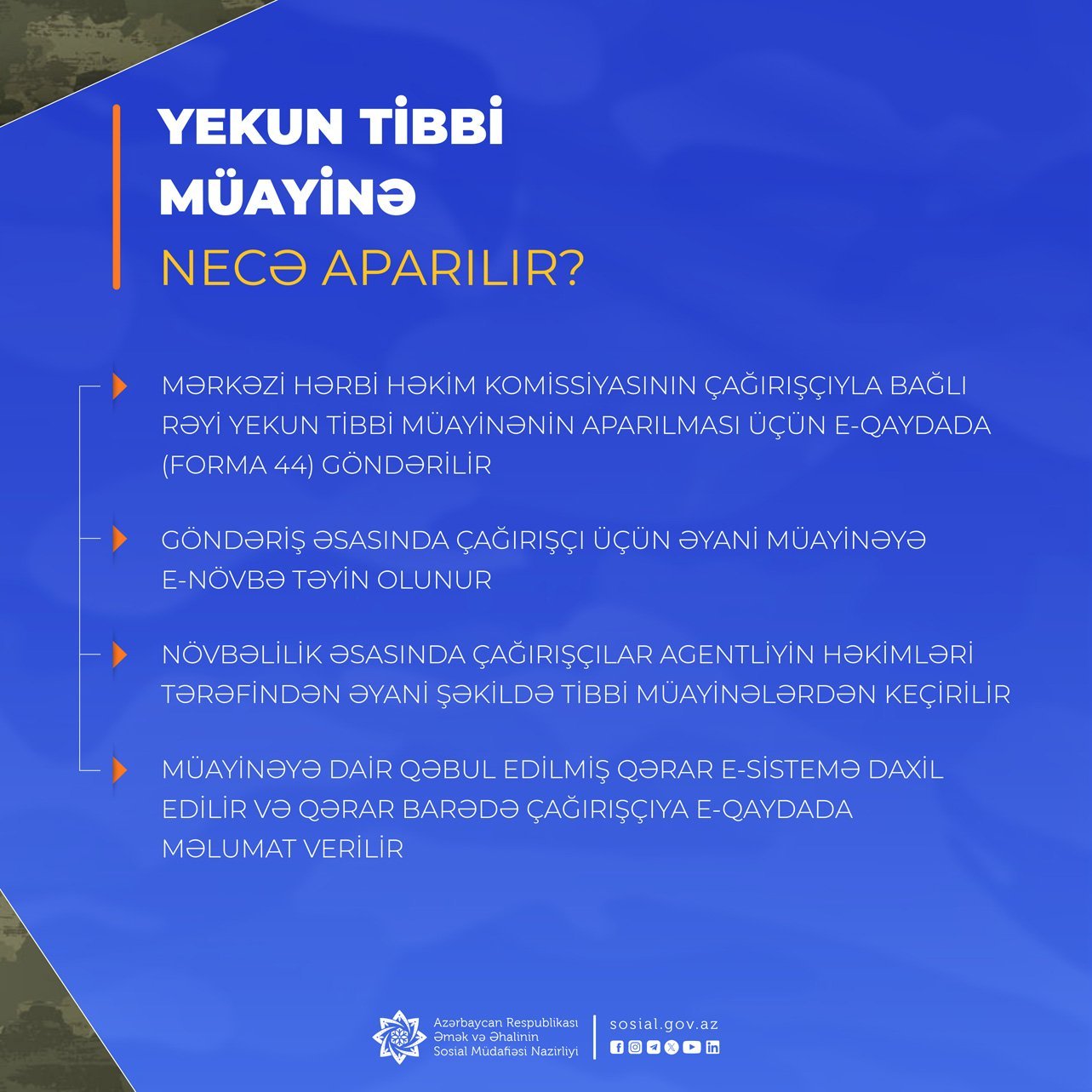 Onu da bildirək ki, çağırışçı yekun tibbi müayinəyə dair qəbul edilmiş qərarla razılaşmadığı halda, o, aidiyyəti qurumların təmsil olunduğu Apellyasiya Şurasına müraciət edə bilər.