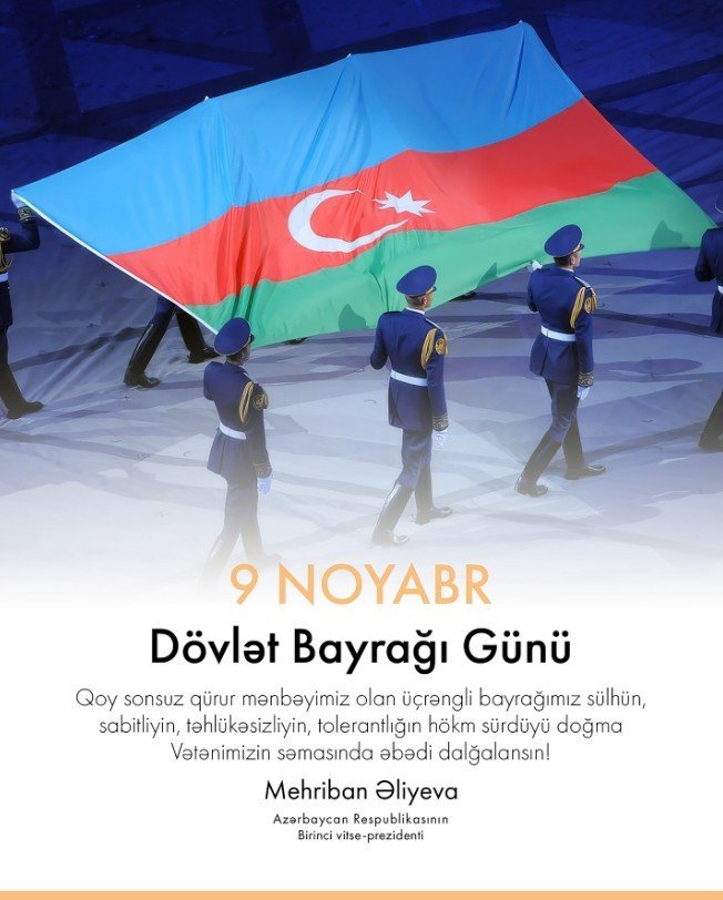 Qoy sonsuz qürur mənbəyimiz olan üçrəngli bayrağımız sülhün, sabitliyin, təhlükəsizliyin, tolerantlığın hökm sürdüyü doğma Vətənimizin səmasında əbədi dalğalansın!”